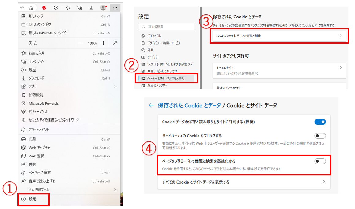[設定] → [Cookieとサイトのアクセス許可]内の[Cookieとサイト データの管理 と削除] → [ページをプリロードして閲覧と検索を高速化する]をオフにします。