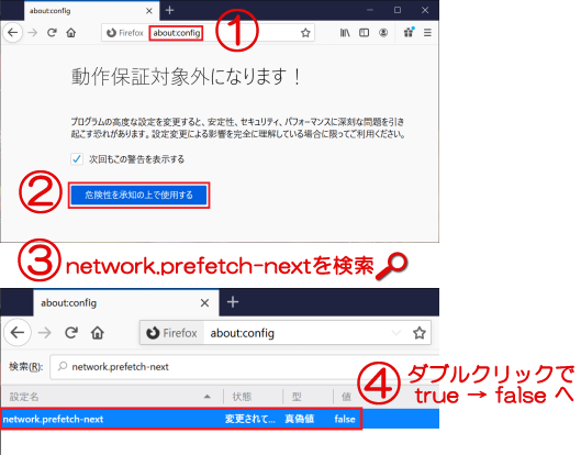 ”動作保証対象外になります!”という警告ページが表示された場合は、[危険性を承知の上で使用する]をクリックします。コンフィグ画面の[network.prefetch-next]をダブルクリックし[false]にします。