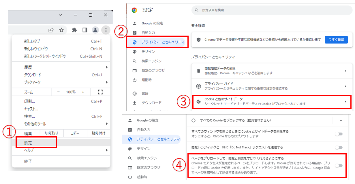 [設定] → [プライバシーとセキュリティ] → [「Cookie と他のサイトデータ]中の[ペ ージをプリロードして、閲覧と検索をすばやく行えるようにする]をオフにします。