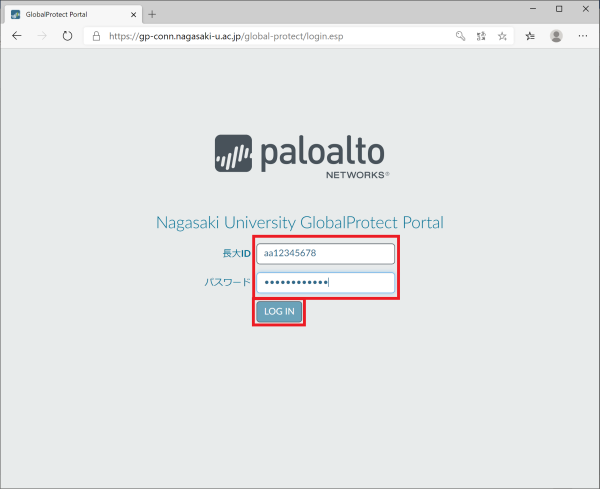 学外でブラウザを起動し、URL欄に「https://gp-conn.nagasaki-u.ac.jp」と入力します。 画面の指示に従って長大IDとパスワードを入力し、[LOGIN]をクリックします。(学内限定)