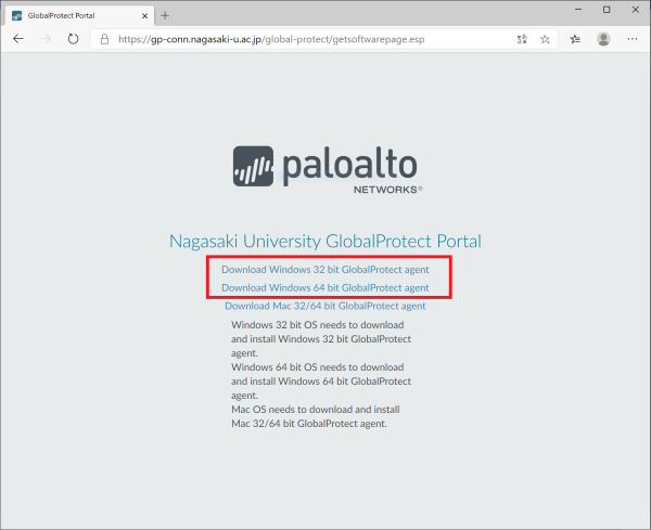ご自身のPCのbitに合わせて[Download Windows〇〇bit GlobalProtect agent]をクリックし、ダウンロードします。